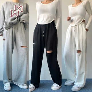 [엘샾] 여성 캐주얼 쭈리 와이드 컷팅 팬츠 허벅지찢 밴딩 쭈리 통바지