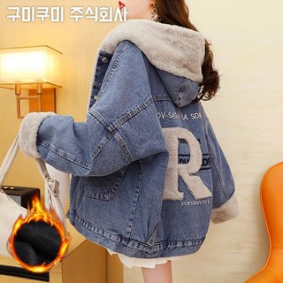 러브심플 날씬해보이는 여성 후드 뽀글이 기모 두꺼운 도톰 따뜻한 데님 자켓 외투 가을 겨울 빅사이즈 레터링 자수 BF 루즈핏 후리스 융털 아우터 외출 간절기 방한복 보온 청자켓