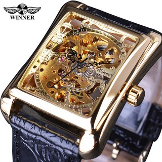 휴비나인 패션기계식시계 위너 2017 레트로 캐주얼 시리즈 사각형 다이얼 디자인 황금 패턴 할로우 스켈레톤 시계 남자 탑 브랜드 럭셔리 기계식
