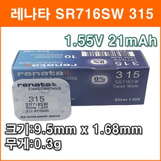 레나타 SR716SW 1개 시계배터리 315 SR67 SR716 SB-AT 280-56 V315 GP315 614 315 건전지, 1개입