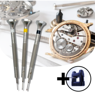 시계 키트: 다양한 크기의 시계를 조정하기 위해 사용되는 도구들의 집합입니다. 시계의 손목띠 크기를 조절하거나 시계의 뒷면을 열 때 사용됩니다.