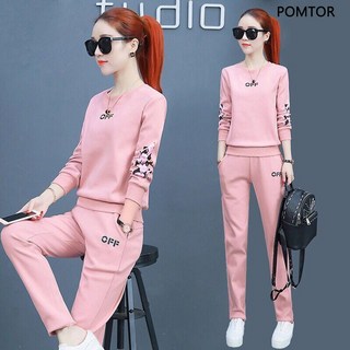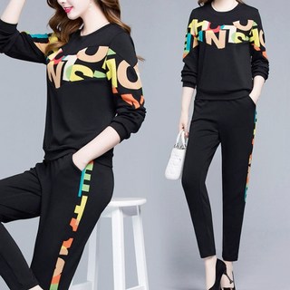 100%순면 캐주얼 운동복세트 여성 봄가을 간절기 데일리 츄리닝복 레터링 맨투맨 라운드 긴팔티셔츠+스트링 밴딩 팬츠 빅사이즈
