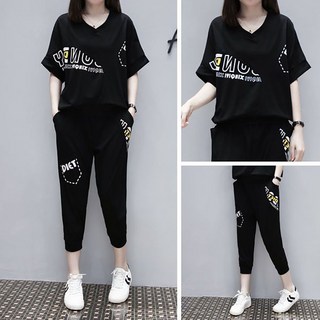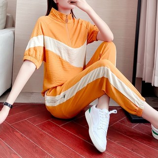 JIEVE 단색 트레이닝 운동복 여성용 봄 여름 데일리룩 반팔 긴바지 세트 투피스 ZY050518