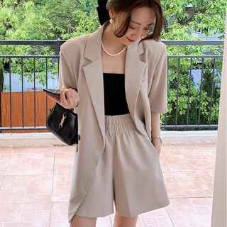 크레스티 여성 여름 얇은 정장 투피스 일상 작업복 하객룩 반바지+반소매 자켓 세트